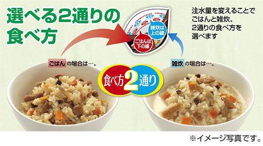 • 注水量を変えることによって、ごはんと雑炊の2通りの食べ方が選べます。雑炊なら、高齢者やお子様にも安心してお召し上がりいただけます。