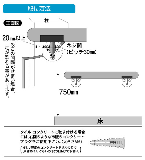 - もし、取付け位置に柱がない(強度が足りない)場合は、市販の「補強板」「ベースプレート」を柱や間柱に取付け、手すりを図のように取付けてください。