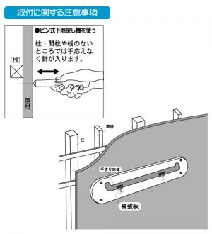 • もし、取付け位置に柱がない(強度が足りない)場合は、市販の「補強板」「ベースプレート」を柱や間柱に取付け、手すりを図のように取付けてください。