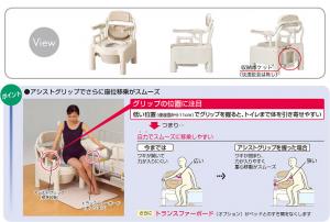 | 材質 | 本体・上蓋・便座・バケツ・アシストグリップ:ポリプロピレン ひじ掛けパイプ・背もたれパイプ:スチール(カチオン電着+塗装) ひじ掛けクッション・背もたれクッション:エチレン酢酸ビニル共重合樹脂 背もたれ本体・キャスター:ポリエチレン |
