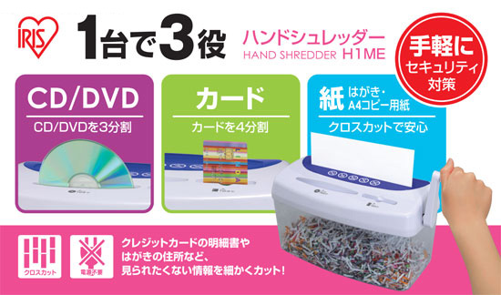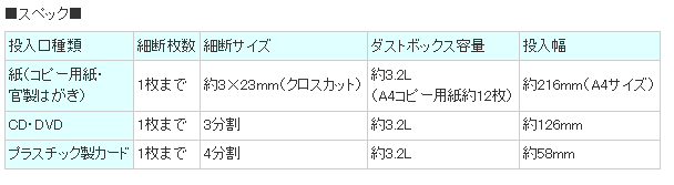 | スペック | ●紙(コピー用紙・官製はがき) 細断枚数:1枚まで 細断サイズ:約3×23mm(クロスカット) ダストボックス容量:約3.2L(A4コピー用紙約12枚) 投入幅:約216mm(A4サイズ) ●CD・DVD 細断枚数:1枚まで 細断サイズ:3分割 ダストボックス容量:約3.2L 投入幅:約126mm ●プラスチック製カード 細断枚数:1枚まで 細断サイズ:4分割 ダストボックス容量:約3.2L 投入幅:約58mm |