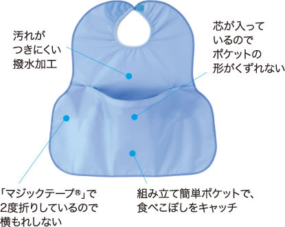• 組み立て簡単なポケットで食べこぼしをキャッチし、食事が楽しめるエプロンです。
