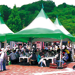| 材質 | 硬質合金アルミフレーム/ 足、桁フレームコーナージョイント(アルミ合金ダイキャスト) 中間ジョイント(アルミ) フレーム接合カバー(合成樹脂) 天幕生地/エステル帆布もしくはターポリン(防水加工、防炎加工、紫外線100%カット) |