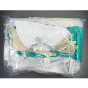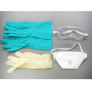 ゴーグル手袋、防護服、靴カバーを、ひとつのセットにして非常時などで利用しや