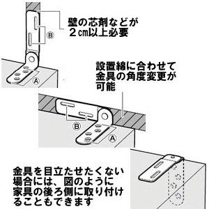 タンスや食器棚などの家具類の固定が出来る家具転倒防止金具です。