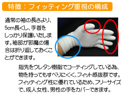 • 指先をウレタン樹脂でコーティングしている為、物を持ってもすべりにくく、フィット感抜群。 フィッティング性に優れているため、フリーサイズで、成人女性、男性の手をカバーできます。
