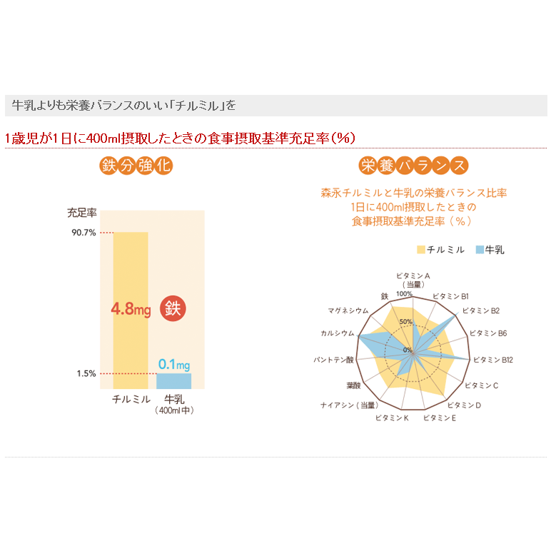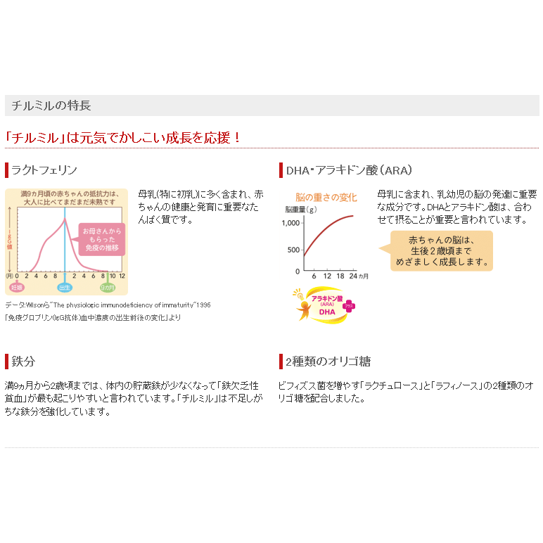 | 原材料名 | 乳糖、調整脂肪(パーム油、パーム核油、大豆油、カノーラ油)、デキストリン、ホエイパウダー(乳清たんぱく質)、脱脂粉乳、たんぱく質濃縮ホエイパウダー、ガゼイン、乳糖分解液(ラクチュロース)、バターミルクパウダー、ラフィノース、精製魚油、アラキドン酸含有油、炭酸カルシウム、塩化マグネシウム、リン酸三カルシウム、レシチン、クエン酸三ナトリウム、炭酸カリウム、塩化カルシウム、リン酸三カリウム、塩化カリウム、ビタミンC、クエン酸、ラクトフェリン、ピロリン酸第二鉄、ビタミンE、ニコチン酸アミド、ビタミンD3、パントテン酸カルシウム、シチジル酸ナトリウム、イノシン酸ナトリウム、ビタミンA、グアニル酸ナトリウム、ウリジル酸ナトリウム、ビタミンB6、5-アデニル酸、ビタミンB1、β-カロテン、葉酸、ビタミンB2、ビタミンB12 |