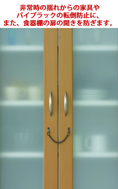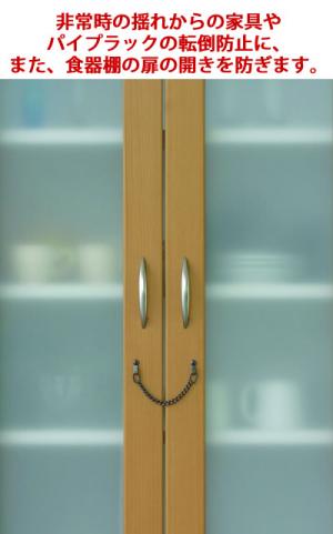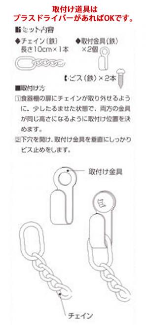| (1) | 食器棚の扉にチェインが取り外せるように、少したるませた状態で、両方の金具が同じ高さになるように取付け位置を決めます。 |