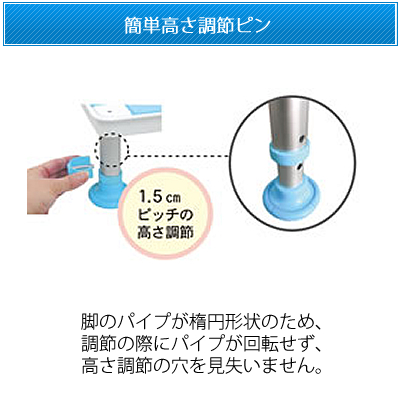 | 脚のパイプが楕円形状のため、調節の際にパイプが回転せず、高さ調節の穴を見失いません。 |