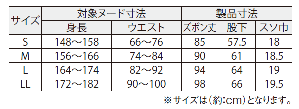 | サイズ | S 身長:148cm〜158cm、ウエスト:66cm〜76cm M 身長:156cm〜166cm、ウエスト:74cm〜84cm L 身長:164cm〜174cm、ウエスト:82cm〜92cm |