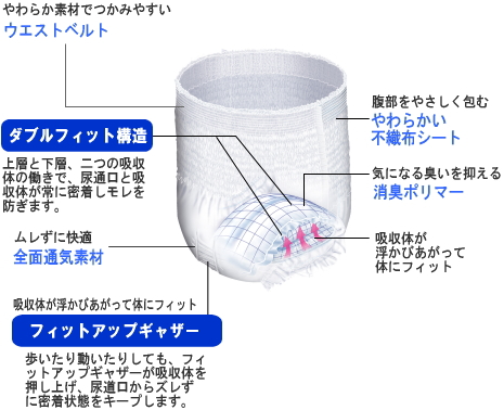 - ダブルフィット構造(2層の吸収体)がフィットして、背モレ・横モレをシャットアウトします。