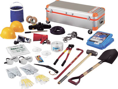 (1)ターピーシート3.6m×5.4m 1個 (2)ショベル970mm 1個 (3)両口大ハンマー#8 1個 (4)バール900mm 1個 (5)ボルトクリッパー600mm 1個 (6)レバーブロック500k 1個 (7)延長コード15A・20m 1個 (8)油圧式パンタジャッキ揚力800kg 1個 (9)布テープ50mm×25m 2個 (10)乾電池「単3」パック4本入 2個 (11)メガホン 1個 (12)ナイロンテープΦ9×30m 1個 (13)鋸「サンクローラップランダー」 1個 (14)粉塵用作業用マスク 2個 (15)カッター 1個 (16)折りたたみ式バケツ 1個 (17)ヘルメット 2個 (18)発電式ライト 1個 (19)ポリ袋「10枚入」90l用 1個 (20)粉塵用セーフティゴーグル 2個 (21)革手袋 2個 (22)安全すべり止め手袋 2個 |