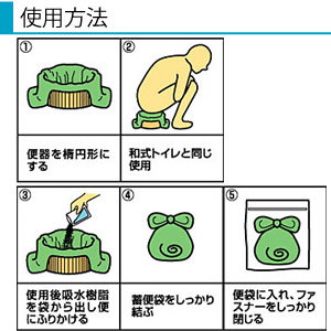 | セット内容 | 蓄便袋、吸水樹脂、ファスナー付便袋、水溶性ポケットティッシュ 各3入、便器 1 |
