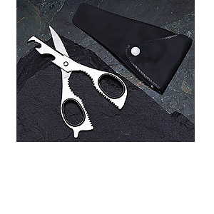 缶切り、栓抜き、ナイフ、ドライバーなどいろいろ使える万能ハサミ。 ベルト通しが付いている収納ケースつき。