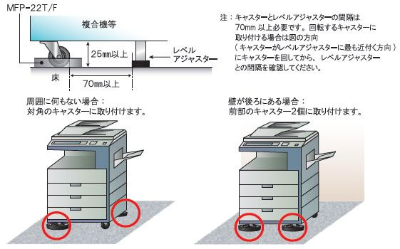 • 製品は2個1セットで、危機の4個のキャスターのうちの対角の2個または前面の2個に取り付けて使用します。