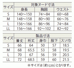 | サイズ | S 身長:140cm〜150cm、胸囲:74cm〜84cm、ウエスト:60cm〜68cm M 身長:148cm〜158cm、胸囲:80cm〜90cm、ウエスト:66cm〜76cm L 身長:156cm〜166cm、胸囲:86cm〜96cm、ウエスト:74cm〜84cm |