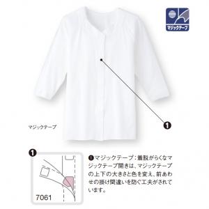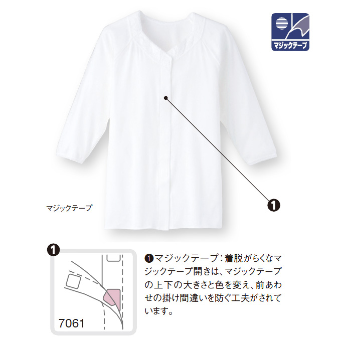 • 着脱がらくなマジックテープ開きは、マジックテープの上下の大きさと色を変えるなど、前あわせの掛け間違いを防ぐ工夫がされています。