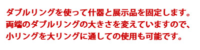 両端のダブルリングの大きさを変えていますので、 小リングを大リングに通しての使用も可能です。