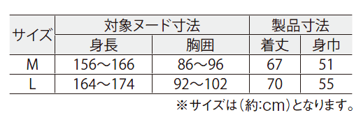 M 身長:156cm〜166cm、胸囲:86cm〜96cm