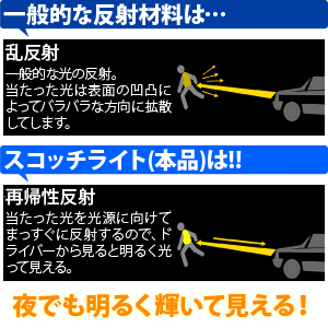 本品は、夜間に屋外で働く作業員の安全性向上のために、ユニフォームなどによく使用される、3M社製<スコッチライト>を主材料として使用した、反射(リフレクター)マスコットです。この<スコッチライト>は、入射光を光源の方向にまっすぐ戻す「再帰性反射」を実現した高機能素材です。車のヘッドライトなどの光を効率よく反射し、夜でも明るく輝いて見えるすぐれた特性を備えています。