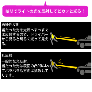 | 暗闇でライトの光を反射してピカッと光る! |