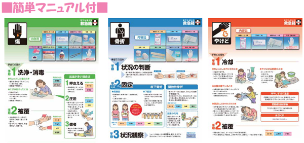 マニュアル付きで、誰にでも正しい手当ができる救急箱です。
