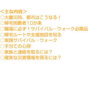 実践的サバイバル・ウォークを中心に、事前の準備や心構え、情報収集のしかた、家族との連絡の取り方など、被災時の行動の要点を箇条書きにして「なにをすべきか」「何をしてはならないか」がすぐわかる紙面構成になっています。