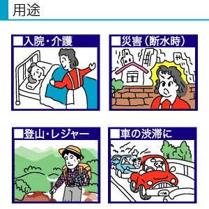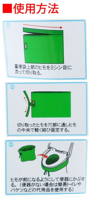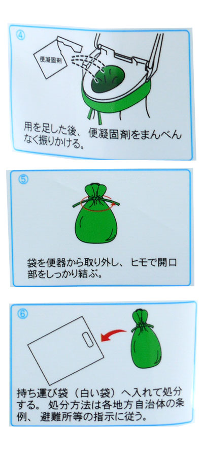 | 素材 | 蓄便袋:ポリエチレン 持ち運び袋:ポリエチレン 便凝固殺菌剤:高分子吸水樹脂、食添用殺菌剤 |