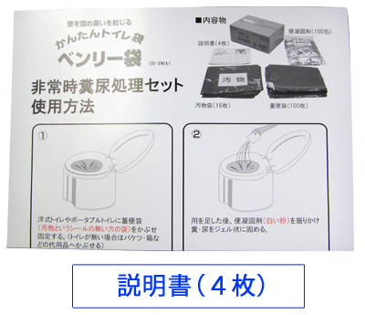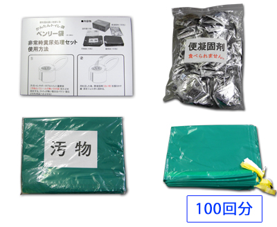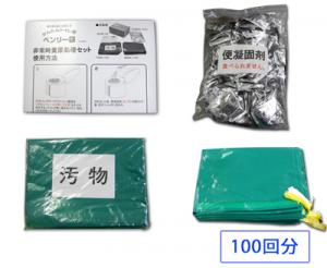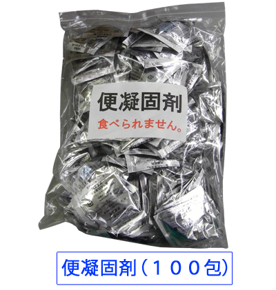 | 内容物 | 説明書(4枚) 便凝固剤(100包) 汚物袋(16枚) 蓄便袋(100枚) |