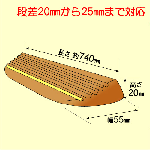 エコマーク認定、介護保険住宅改修対象の段差解消スロープ。暗闇でもわかるように蓄光ラインを付け、つまづきを防止するために両端部を丸く加工するなど安全仕上げにしました。段差20?〜25?まで対応、取り付け簡単!両面テープ付。