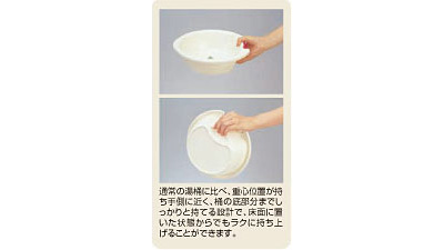 • 通常の湯桶に比べ、重心位置が持ち手側に近く、桶の底部までしっかりと持てる設計で、床面に置いた状態からでもラクに持ち上げることができます。