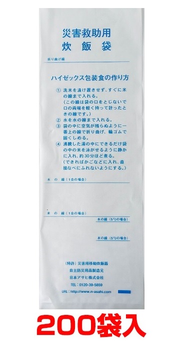 - 災害時、多くの人々が疲れはてグッタリしている時、温かいご飯は何よりも心を癒してくれます。今まで話した事もない近所の方々とふれあいながら炊出しをする事で連帯感が生まれ、明日へのカテとなり、元気を取り戻す素となります。炊飯袋(ハイゼックス包装食)は、作り方が簡単なので、全員で楽しみながら炊飯できます。