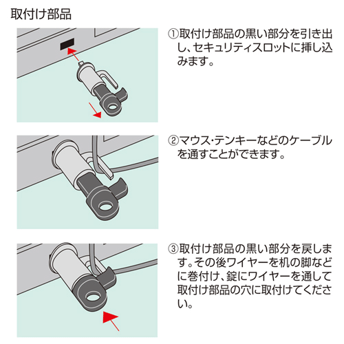 • ノート・デスクトップパソコン他セキュリティスロットを持つ機種(液晶ディスプレイ、プロジェクターなど)に簡単取り付けできます。