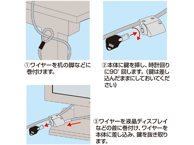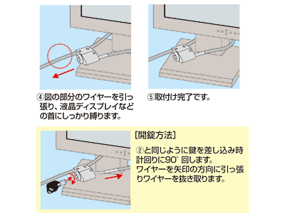 机などの固定物にワイヤーを結び、液晶ディスプレイの首部分に施錠をします。