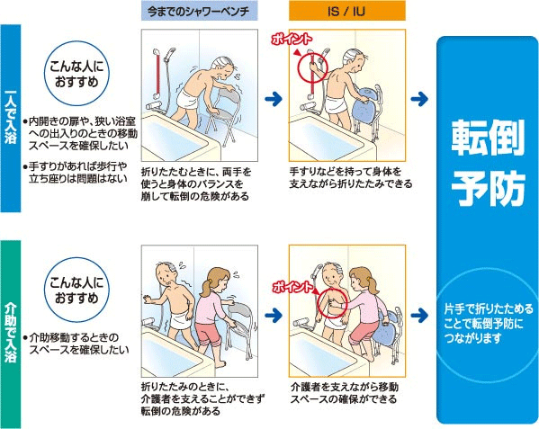 • 手すりなどを持って身体を支えながら折りたたみ動作ができるので転倒リスクを軽減!