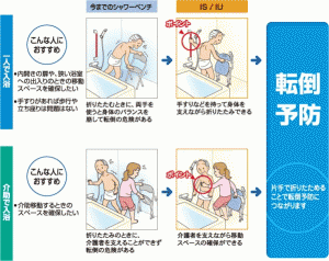 • 移動スペースを確保したいとき・介助スペースを確保したいとき、そんな時に片手で簡単、すばやく折りたたみができる、ひじ掛け跳ね上げ式のシャワーベンチ