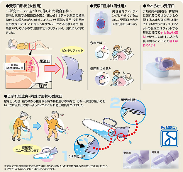 尿をとった後、股の間から抜き取る時や持ち運びの時など、万が一尿器が傾いても一気に流れ出さないように2つのこぼれ防止機能をつけました。(こぼれ防止弁、両受け形状)