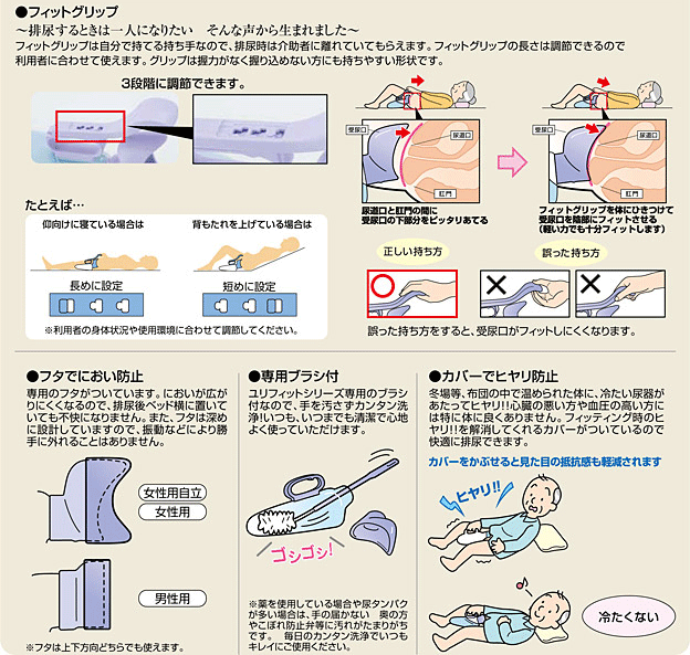 フィッティング時のヒヤリ!!を解消してくれるカバーがついているので快適に排尿できます。カバーをかぶせると見た目の抵抗感も軽減されます。