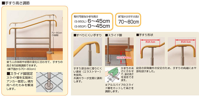 手すり部全体にすべりにくい素材(エラストマー)を採用。木調カラーが玄関に調和します。