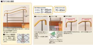 使う人の体格や状態の変化に合わせて、手すりの高さを5段階調節できます。(廊下面から70〜80cm)
