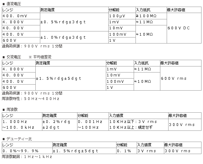 | オーバーレンジ表示 | サインが点灯(ただしDC/AC600Vは除く) |