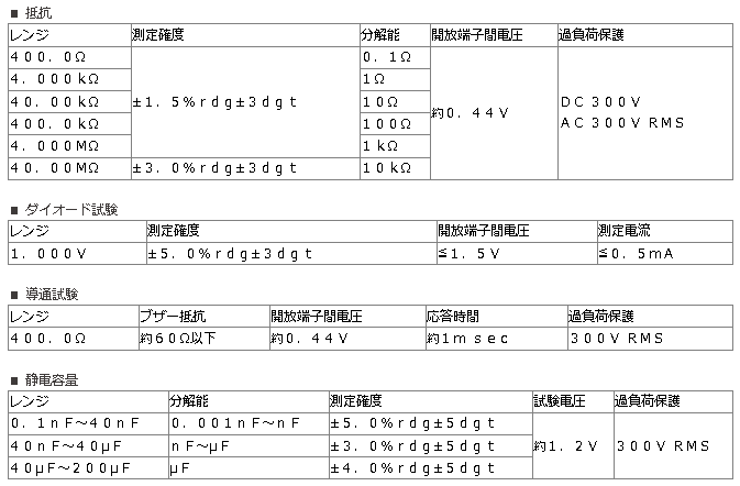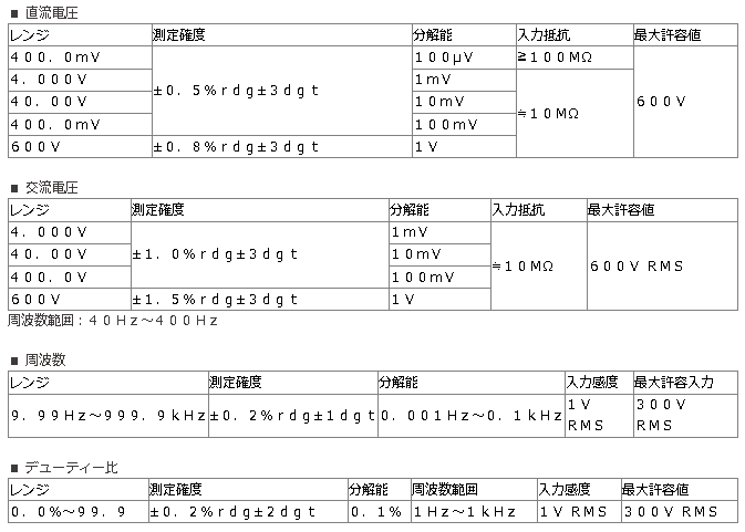 | オーバーレンジ表示 | サインが点灯(ただしDC/AC600Vは除く) |