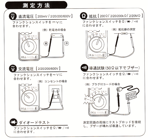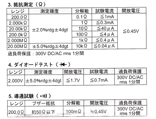 | 導通試験 | LCD上にサイン及びブザー音) a.約50Ω以下でブザー音 b.開放電圧:約0.45V |