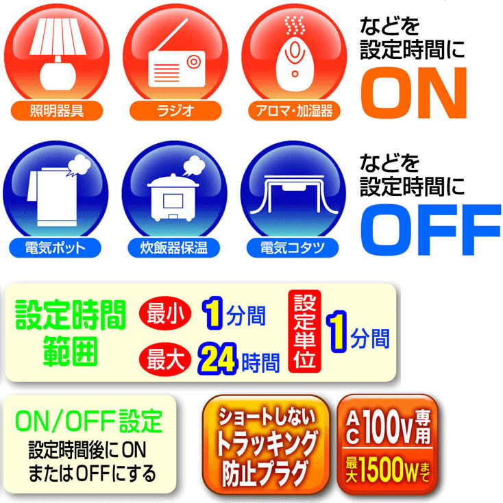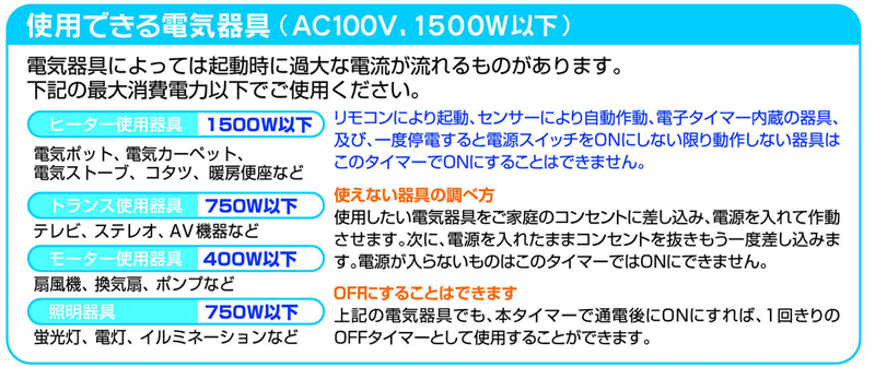 ※リモコンにより起動、センサーにより自動作動、電子タイマー内臓の器具、及び、一度停電すると電源スイッチをONにしない限り動作しない器具はこのタイマーでONにすることはできません。