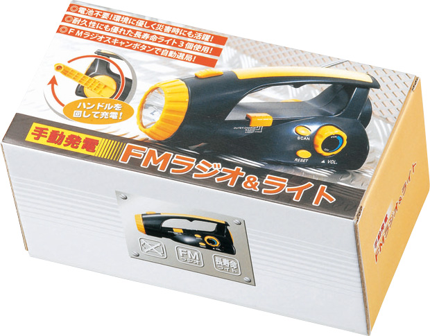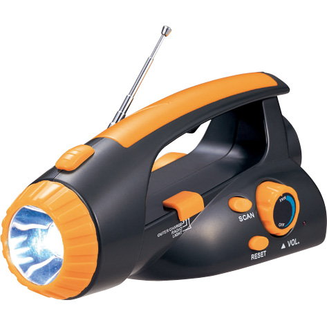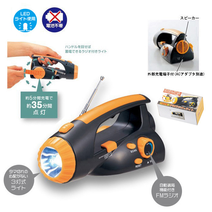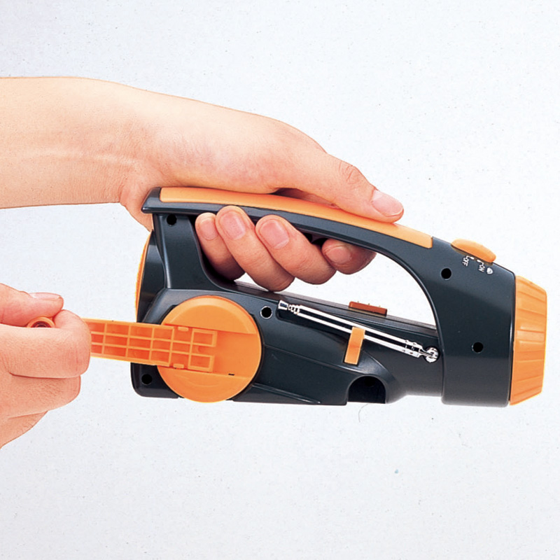 - ハンドルを回せば蓄電できるラシオ付きライト