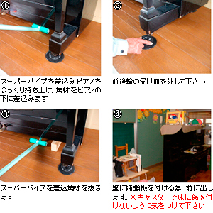1.スーパーパイプを差込みピアノをゆっくり持ち上げ、角材をピアノの下に差込みます