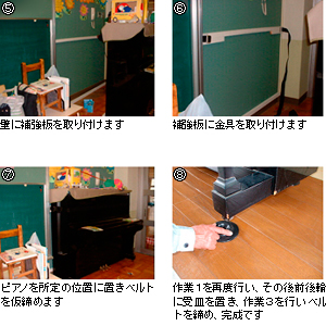 ここは空白です 壁に金具を取り付けピアノに鉢巻をするように締め付けます。
