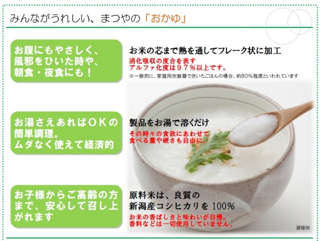- フレーク状の粒なしタイプで、お腹に優しく、赤ちゃんから高齢の方まで、どなたでも食べられるやわらかおかゆです。