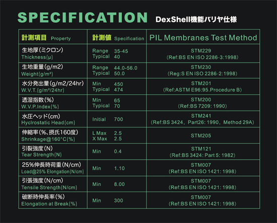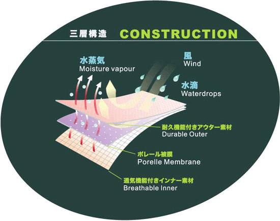 | 性能 | 防水、風防、通気機能および保温機能。 |