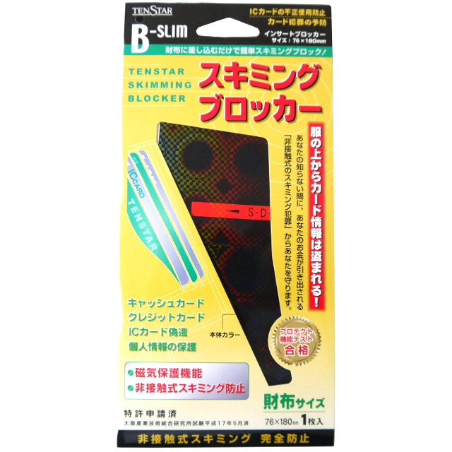 • 本品はブロッカー装着時の非接触式スキミング防止商品です。ブロッカーからカード類を出している状態でのスキミング行為に対しての一切の責任は負いかねますのでご注意下さい。